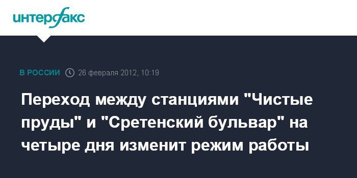 Москва. 26 февраля. INTERFAX.RU - В связи ремонтом эскалатора с 28 февраля по 2 марта будет изменен режим работы перехода между станциями московского метро "Чистые пруды" и "Сретенский бульвар". "В эти дни с 8:00 до 9:00 эскалаторы будут работать только на подъем (со "Сретенского бульвара" на "Чистые пруды"), а переход со станции "Чистые пруды" на "Сретенский бульвар" будет осуществляться через станцию "Тургеневская", - сообщили "Интерфаксу" в пресс-службе метрополитена.