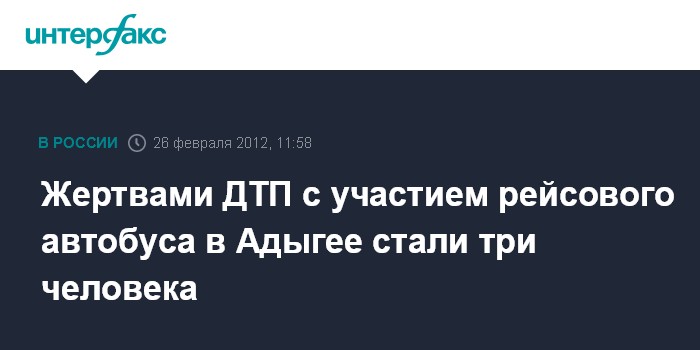 Ростов-на-Дону.26 февраля. INTERFAX.RU - Рейсовый автобус врезался в дерево в Красногвардейском районе Адыгеи, в результате, по предварительным данным, три человека погибли, сообщили агентству "Интерфакс-Юг" в правоохранительных органах республики. "Согласно предварительной информации, ДТП произошло в 11:20 мск на автотрассе Майкоп - Усть-Лабинск. Пассажирский автобус, выполнявший рейс по маршруту Тихорецк-Майкоп столкнулся с деревом. По предварительным данным, трое человек, находившихся в автобусе погибли, еще 10 пострадали", - сказал собеседник агентства.