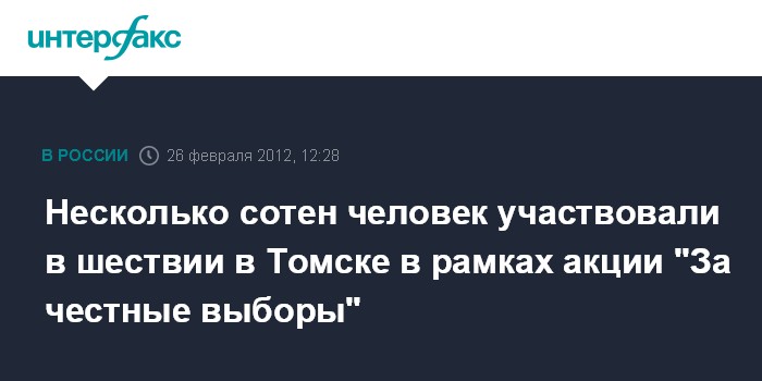 Томск. 26 февраля. INTERFAX.RU - Санкционированное шествие "За честные выборы" прошло в воскресенье в центре Томска, передал корреспондент агентства "Интерфакс-Сибирь". В пресс-службе УМВД по Томской области агентству сообщили, что в мероприятии приняли участие около 300 человек. По оценкам организаторов, которыми выступили движение "Солидарность" и КПРФ, шествие собрало около 600 человек.