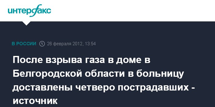 Москва. 26 февраля. INTERFAX.RU - Четыре человека госпитализированы в результате взрыва газа в жилой многоэтажке в Белгородской области, сообщил "Интерфаксу" источник в управлении здравоохранения региона. "В результате взрыва и пожара в больницу города Строитель были госпитализированы четыре жителя дома по улице Жукова, у всех них - ожоги различных степеней тяжести", - отметил источник.