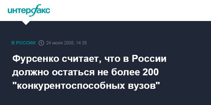 Москва. 24 июля. INTERFAX.RU - Министр образования и науки Андрей Фурсенко считает, что из общего числа ныне действующих в России вузов должно остаться не более 15-20%.
