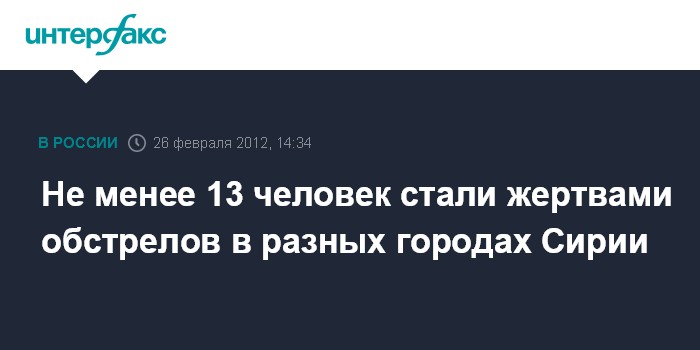 Каир. 26 февраля. INTERFAX.RU - По меньшей мере, 13 человек были убиты в результате артобстрелов и нападений, совершаемых правительственными военными в отношении оппозиционеров в различных городах Сирии, заявили в воскресенье представители сирийских координационных комитетов. Большинство погибших зафиксировано в городе Хомсе, в центральной части страны. Среди них - имам мечети.