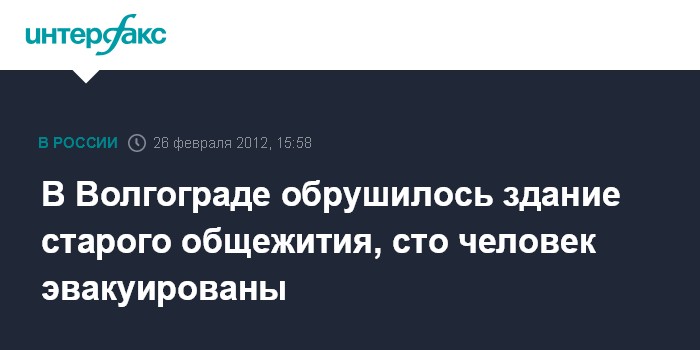 Волгоград. 26 февраля. INTERFAX.RU - В Тракторозаводском районе Волгограда произошло обрушение части здания старого общежития. "В старом здании бывшего общежития Минобороны произошло обрушение в районе, где располагались душевые комнаты. Жертв нет, сто человек эвакуированы", - сообщила агентству "Интерфакс-Юг" представитель ГУ МВД по Волгоградской области Светлана Смольянинова. На месте работают представители ГУ МВД, проводится проверка.