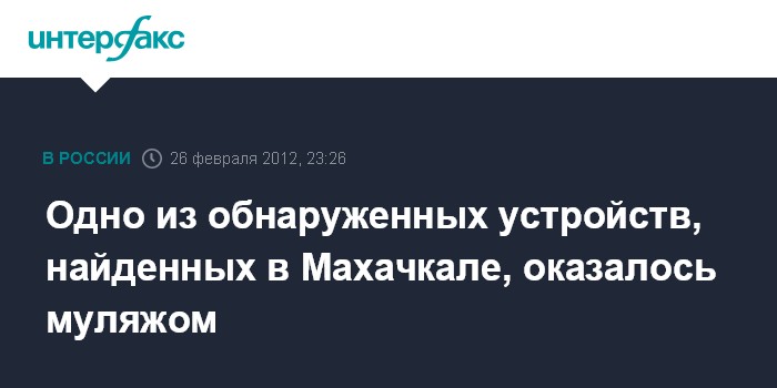 Махачкала. 26 февраля. ИНТЕРФАКС-ЮГ - Одно из двух подозрительных устройств, обнаруженных вечером в воскресенье в Махачкале, оказалось муляжом, сообщили агентству «Интерфакс-Юг» в пресс-службе УФСБ России по Дагестану.