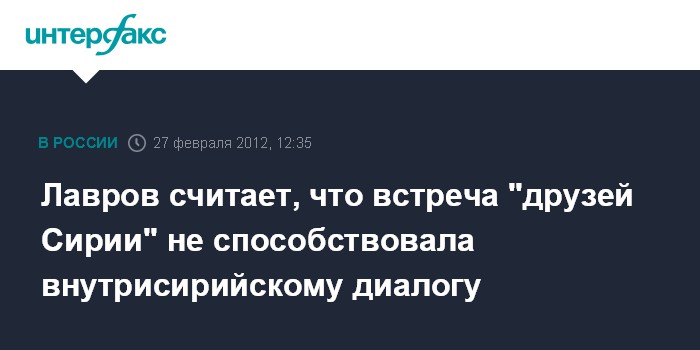Москва. 27 февраля. INTERFAX.RU - Встреча "друзей Сирии" в Тунисе не способствовала налаживанию внутрисирийского диалога, заявил глава МИД РФ Сергей Лавров.