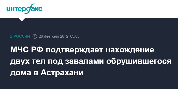 Москва. 28 февраля. ИНТЕРФАКС - МЧС России официально подтвердило обнаружение под завалами частично обрушившегося в Астрахани многоэтажного дома от взрыва газа двух человек.