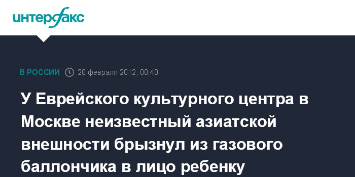 Москва. 28 февраля. INTERFAX.RU - Неизвестный брызнул из газового баллончика в лицо трехлетнему ребенку на выходе из Еврейского культурного центра в Москве, сообщили "Интерфаксу" в пресс-службе ГУ МВД России по Москве во вторник.