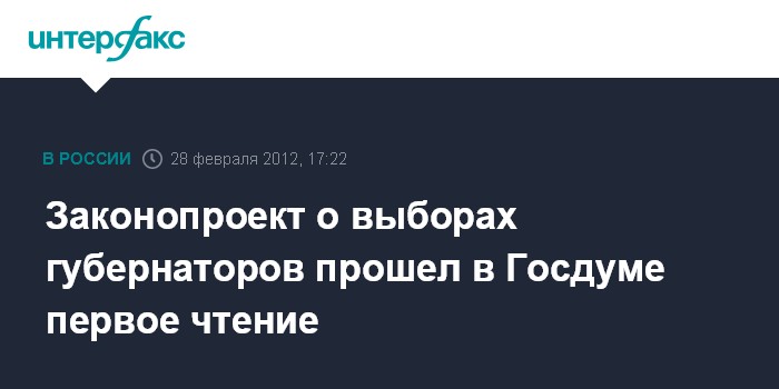 Москва. 28 февраля. INTERFAX.RU - Госдума во вторник приняла в первом чтении инициированный президентом РФ Дмитрием Медведевым законопроект о выборах губернаторов.
