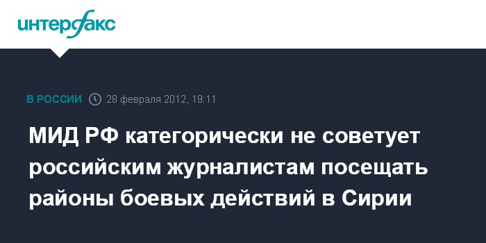 Москва. 28 февраля. INTERFAX.RU - Все российские журналисты в Сирии должны воздерживаться от посещения районов боевых действий, заявил МИД РФ.