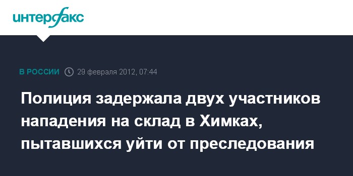 Москва. 29 февраля. ИНТЕРФАКС - Два участника нападения на склад в Химках, пытавшихся скрыться от правоохранителей, задержаны, сообщил "Интерфаксу" руководитель пресс-службы ГУ МЧС России по Московской области Евгений Гильдеев.