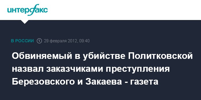 "Показания о том, что Ахмед Закаев и Борис Березовский могли являться заказчиками совершенного в октябре 2006 года убийства обозревателя "Новой газеты" Анны Политковской, подследственный Павлюченков дал следователям СКР в минувшую пятницу", - сообщает издание со ссылкой на собственную информацию.