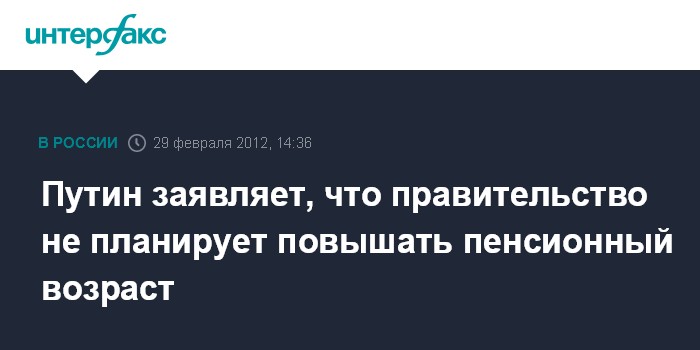 Москва. 29 февраля. INTERFAX.RU - Глава правительства РФ Владимир Путин заявляет, что у российского руководства нет планов по увеличению пенсионного возраста в стране.