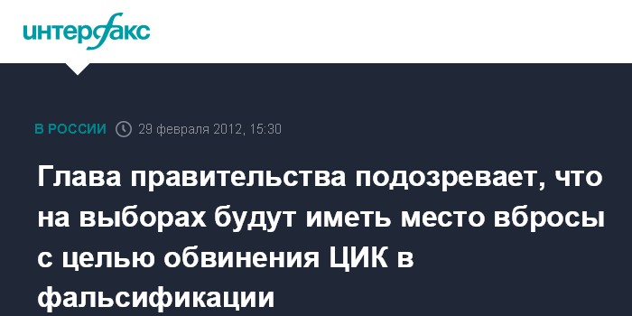 Москва. 29 февраля. INTERFAX.RU - Премьер-министр РФ, кандидат в президенты Владимир Путин заявил, что его оппоненты готовятся к намеренным вбросам избирательных бюллетеней в ходе выборов в президенты РФ с тем, чтобы затем иметь основания для утверждений о нелегитимности выборов.