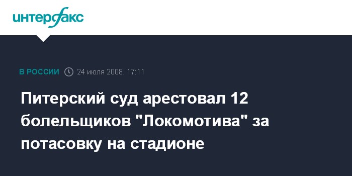 Москва. 24 июля. INTERFAX.RU - Мировой суд Петроградского района Петербурга арестовал и оштрафовал задержанных накануне за потасовку на стадионе "Петровский" болельщиков столичного "Локомотива".