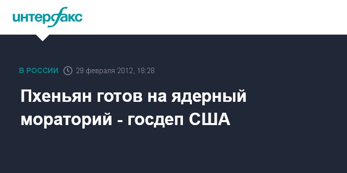 Вашингтон. 29 февраля. INTERFAX.RU - КНДР согласилась на выполнение моратория на ядерные испытания, запуски баллистических ракет большой дальности и на ядерную деятельность, в том числе и на обогащение урана на объекте в Йонбене, заявили в среду в государственном департаменте США.