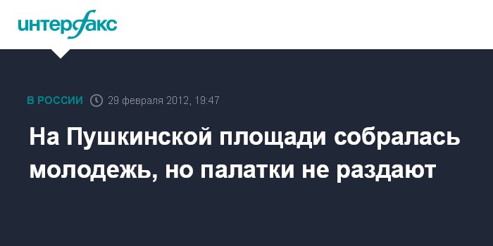 Москва. 29 февраля. INTERFAX.RU - Несколько десятков молодых людей собрались на Пушкинской площади в центре Москвы в ожидании обещанной представителями внесистемной оппозиции раздачи палаток, передает корреспондент "Интерфакса".