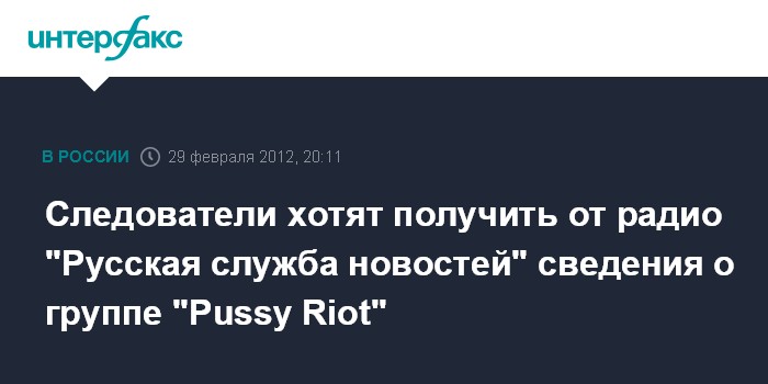 Москва. 29 февраля. INTERFAX.RU - В адрес редакции радио "Русская служба новостей" направлено уведомление о необходимости получить сведения по поводу предоставления эфира участницам группы "Pussy Riot", которые устроили акцию в храме Христа Спасителя; кроме того, следователи должны вручить повестку о вызове на допрос сотруднику радиостанции, сообщили "Интерфаксу" в пресс-службе ГУ МВД РФ по Москве.