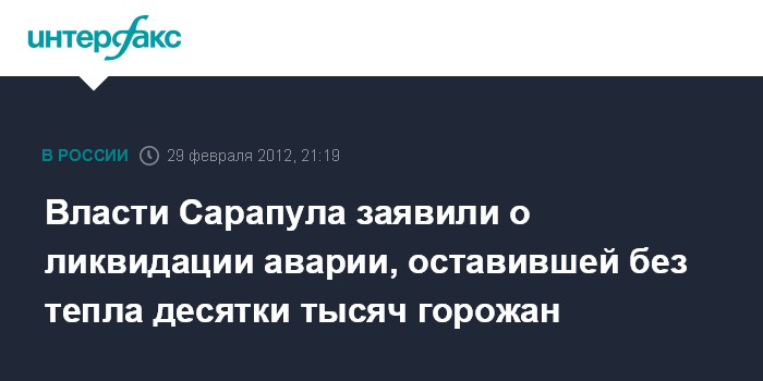 Ижевск. 29 февраля. INTERFAX.RU - Авария на газопроводе, из-за которой около 20 тыс. жителей г.Сарапул (Удмуртия) остались без газа, теплоснабжения и горячей воды, ликвидирована, сообщил агентству "Интерфакс-Поволжье" глава администрации Сарапула Анатолий Сизов в среду вечером.