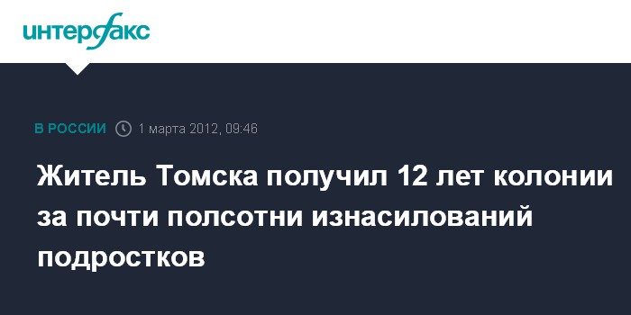 Томск. 1 марта. INTERFAX.RU - Суд в Томске признал местного жителя виновным в сексуальном насилии над подростками и назначил ему наказание в виде лишения свободы на 12 лет, сообщила агентству "Интерфакс-Сибирь" в четверг заместитель прокурора Октябрьского района Томска Елена Гришанова.