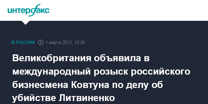 "В рамках расследования уголовного дела об убийстве бывшего сотрудника ФСБ России Александра Литвиненко выдан ордер на международный розыск Д.Ковтуна. На его основании россиянин должен быть арестован властями страны, на территории которой он окажется", - отметил собеседник агентства.
