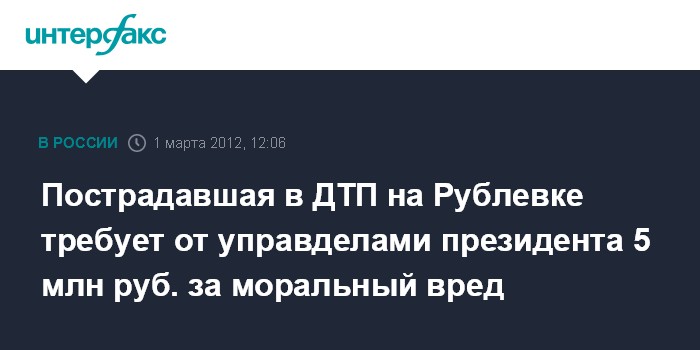 Москва. 1 марта. INTERFAX.RU - Пострадавшая в ДТП на Рублево-Успенском шоссе Елена Ярош требует от управделами президента РФ, чей водитель стал виновником аварии, более 6 млн рублей в досудебном порядке в счет возмещения ущерба и компенсации морального вреда.
