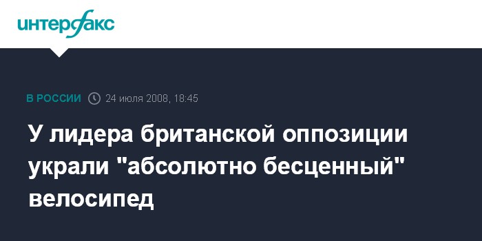 Лондон. 24 июля. INTERFAX.RU - Лидер британской оппозиционной Консервативной партии Дэвид Кэмерон был "просто ошарашен", когда, выйдя из магазина, обнаружил, что его велосипед украли, сообщают газеты Соединенного Королевства.