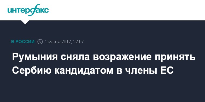 Брюссель. 1 марта. INTERFAX.RU - Румыния, последняя страна на пути Сербии к статусу кандидата в члены ЕС, сняла свое возражение, сообщили журналистам в кулуарах саммита ЕС европейские дипломаты.