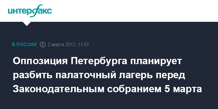 Санкт-Петербург. 2 марта. INTERFAX.RU - Активисты петербургских оппозиционных движений намерены устроить бессрочный палаточный лагерь перед зданием городского парламента после выборов президента РФ 5 марта, сообщила "Интерфаксу" в пятницу исполнительный директор Объединенного гражданского фронта Ольга Курносова.
