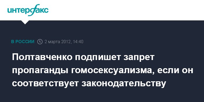 Санкт-Петербург. 2 марта. INTERFAX.RU - Губернатор Петербурга Георгий Полтавченко заявил, что пока не получал принятый в среду депутатами Законодательного Собрания города закон о запрете пропаганды гомосексуализма и педофилии, который должны были предоставить ему на подпись.