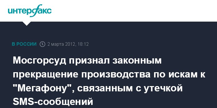 Москва 2 марта. INTERFAX.RU - Мосгорсуд признал законным прекращение производства по искам, связанным с утечкой SMS-сообщений, к сотовому оператору Мегафон, сообщает "Интерфакс".