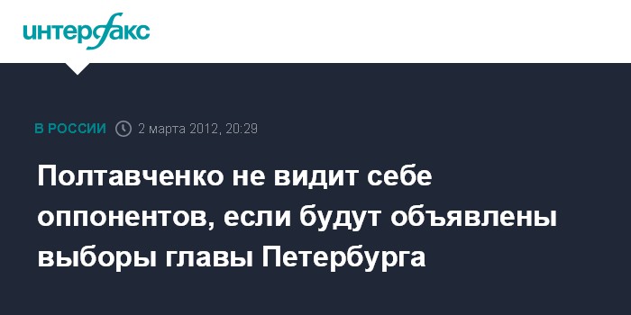 Санкт-Петербург. 2 марта. INTERFAX.RU - Губернатор Петербурга Георгий Полтавченко пока не знает, будут ли в ближайшее время проводиться выборы главы города, однако считает, что у него нет оппонентов в борьбе за этот пост.