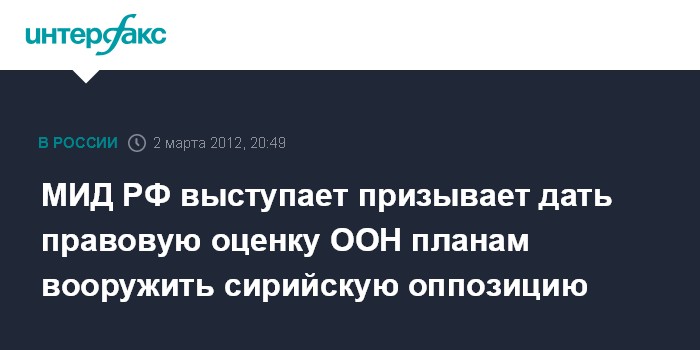 Москва. 2 марта. INTERFAX.RU - Официальный представитель МИД РФ заявил, что структуры ООН должны дать правовую оценку высказываниям официальных лиц разных стран, выступающих за вооружение боевых отрядов сирийской оппозиции.