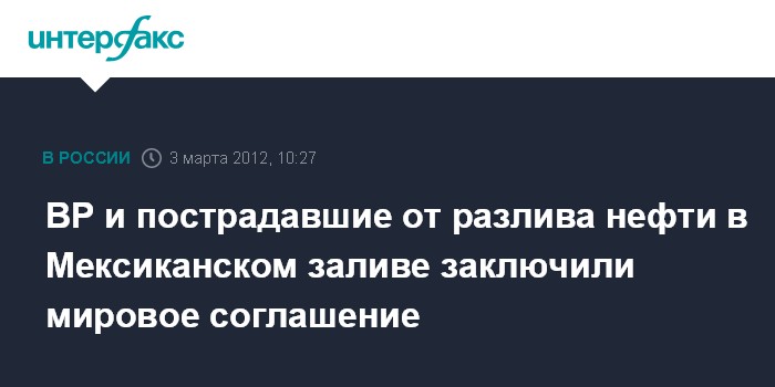 Лондон. 3 марта. INTERFAX.RU - Британская нефтяная компания BP заключила с пострадавшими от разлива нефти в результате аварии на платформе Deepwater Horizon в Мексиканском заливе в 2010 году досудебное соглашение о размерах компенсаций, сообщает в субботу Би-би-си. По словам судьи Карла Барбера, процесс по этому делу будет перенесен на более поздний срок из-за "новых позиций сторон". Ранее первое слушание по делу о претензиях к BP было запланировано на понедельник.
