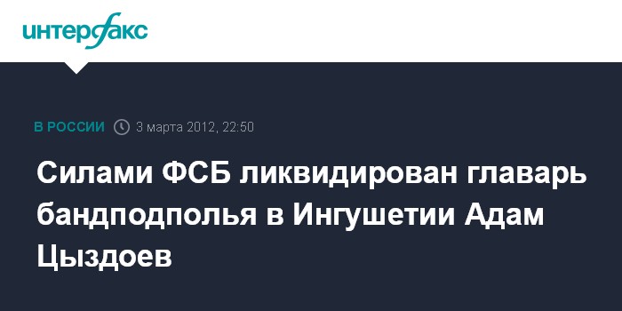 Москва. 3 марта. ИНТЕРФАКС - Сотрудники ФСБ в ходе спецоперации ликвидировали в Малгобеке (Ингушетия) в субботу главаря бандподполья в Ингушетии Адама Цыздоева, сообщает Национальный антитеррористический комитет.