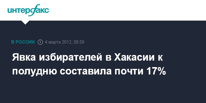 Абакан. 4 марта. INTERFAX.RU - К 12:00 в Хакасии проголосовали 17,7% избирателей (66,8 тысяч человек), сообщил журналистам руководитель избирательной комиссии Хакасии Александр Чуманин. "Это чуть меньше, чем на думских выборах в декабре 2011 года и на предыдущих выборах президента. На декабрьских выборах явка на это же время составляла 19,04%. По сравнению с 2008 годом явка ниже примерно на 4%", - отметил А. Чуманин.