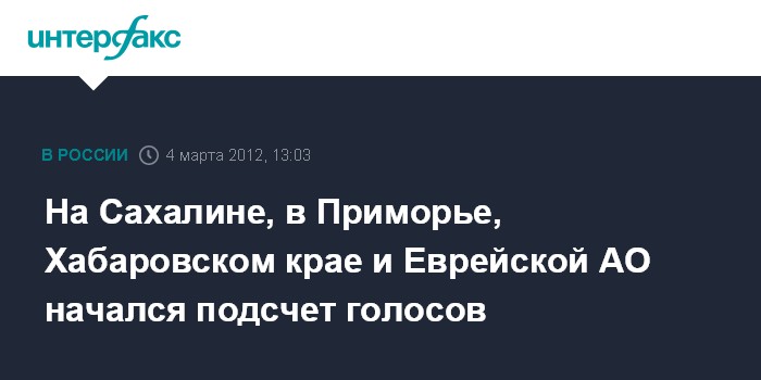 Южно-Сахалинск/Владивосток/Хабаровск/Биробиджан. 4 марта. INTERFAX.RU - Еще в четырех регионах Дальнего Востока закрылись избирательные участки, где жители выбирали президента РФ - на Сахалине, в Приморье, Хабаровском крае и Еврейской АО (ЕАО).
