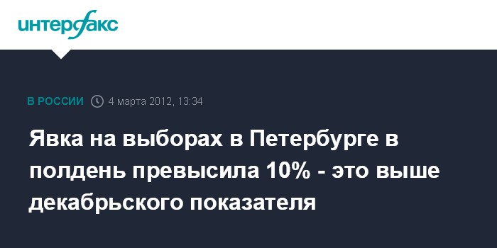 Санкт-Петербург. 4 марта. INTERFAX.RU - Явка петербуржцев на выборах президента РФ к 12.00 мск составила 10,62% от общего количества зарегистрированных избирателей, сообщил на брифинге в воскресенье глава избирательной комиссии города Александр Гнетов. Он отметил, что в ряде территориальных избирательных комиссий наблюдается опережение среднегородской явки. В частности, в ТИК N15 проголосовало уже 16% избирателей, в ТИК 29 - 17%.