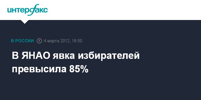 Салехард. 4 марта. INTERFAX.RU - Явка избирателей Ямало-Ненецкого автономного округа на выборах президента РФ, по данным на 18:00 местного времени, составила 85,29%, сообщила агентству "Интерфакс-Урал" член избиркома ЯНАО с правом решающего голоса Татьяна Винокурова. По ее словам, на думских выборах в декабре 2011 года на это же время явка составляла 68%, на выборах президента в 2008 году - 80%. Т.Винокурова добавила, что ни одного заявления о нарушениях в окружной избирком пока не поступало.