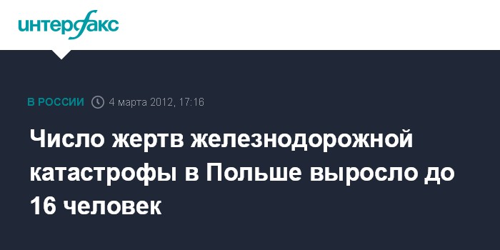 Варшава/Рига. 4 марта. INTERFAX.RU/BNS - Столкновение двух поездов, произошедшее в Польше, по последним данным, привело к гибели 16 человек, передают в воскресенье варшавские СМИ. В то же время спасатели, находящиеся на месте происшествия, отметили, что еще не закончили работу. Они предупреждают, что число жертв может еще вырасти. Кроме того, в службе спасения сообщили, что все 56 человек, получившие травмы доставлены в больницы.