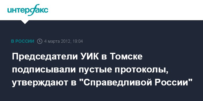 Томск. 4 марта. INTERFAX.RU - Наблюдатели созданного оппозицией "Центра гражданского контроля за выборами" утверждают, что выявили серьезные нарушения на двух избирательных участках в Томске. "Есть видеозапись, как на двух участках председатели участковых избирательных комиссий (УИК) подписывали пустые протоколы", - , сообщила в воскресенье агентству "Интерфакс-Сибирь" председатель регионального отделения "Справедливой России" Галина Немцева.