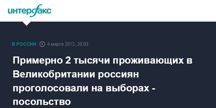 Лондон. 4 марта. INTERFAX.RU - Примерно 2 тыс. граждан РФ, проживающих в Великобритании, уже проголосовали на президентских выборах, сообщили в российском посольстве в Лондоне. "Около 2 тыс. избирателей проголосовали на 15:00", - говорится в сообщении, размещенном на ленте новостей посольства в сети Twitter. Ранее в воскресенье посольство сообщало, что голосование проводится на избирательных участках в Лондоне и Эдинбурге.
