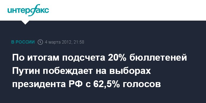 Москва. 4 марта. INTERFAX.RU - На выборах президента РФ после подсчета 20% протоколов премьер-министр РФ Владимир Путин набирает 62,5%.
