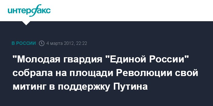 Москва. 4 марта. ИНТЕРФАКС - На площади Революции в центре Москвы стартовал митинг "Молодой гвардии "Единой России" в поддержку кандидата в президенты Владимира Путина.
