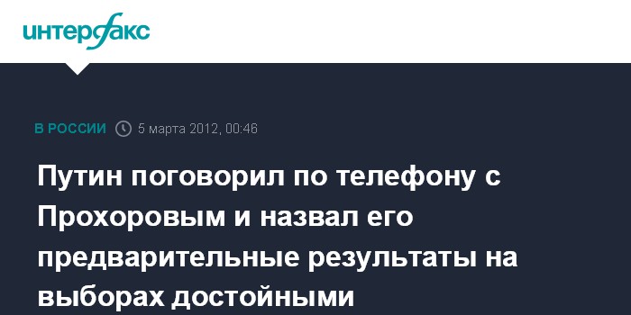 Москва. 5 марта. INTERFAX.RU - Кандидат в президенты РФ Владимир Путин переговорил по телефону с другим кандидатом на пост главы государства Михаилом Прохоровым.
