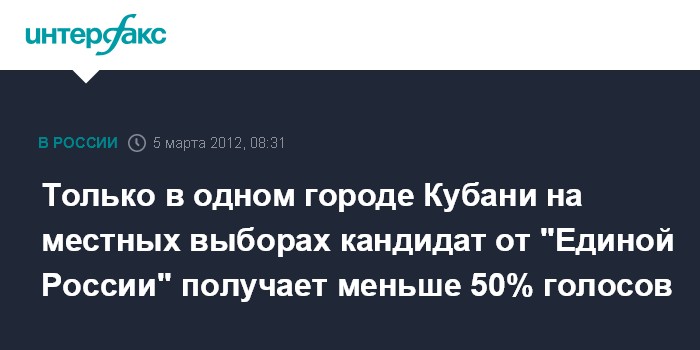 Краснодар. 5 марта. INTERFAX.RU - На выборах глав пяти городов и двух районов Краснодарского края, по предварительным данным, побеждают нынешние руководители из партии "Единая Россия", и только в г.Усть-Лабинске никто из кандидатов не получил более половины голосов.