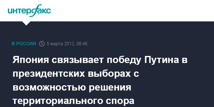 Источники в японском правительстве приветствуют победу Путина, поскольку "он понимает важность территориального спора и готов к урегулированию конфликта". Собеседники NHK полагают, что Япония попытается продолжить диалог с Россией, воспользовавшись возвращением на главный пост В.Путина.