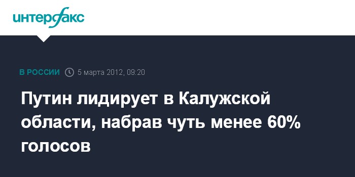 Калуга. 5 марта. INTERFAX.RU - По результатам обработки около 97,5% избирательных бюллетеней, кандидат в президенты РФ Владимир Путин лидирует на выборах в Калужской области, набрав 59,02% голосов, сообщили "Интерфаксу" в облизбиркоме.