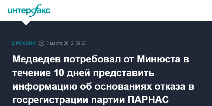 Москва. 5 марта. INTERFAX.RU - Президент России Дмитрий Медведев поручил Министерству юстиции РФ представить информацию об основаниях отказа в государственной регистрации Партии народной свободы "За Россию без произвола и коррупции" (ПАРНАС).