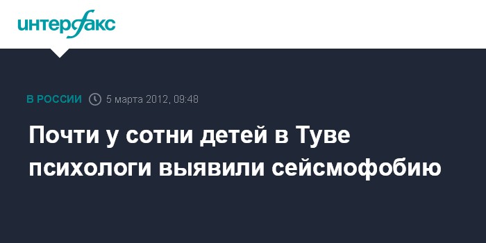 Кызыл. 5 марта. INTERFAX.RU - Психологи центра "Сайзырал" в Туве, обследовавшие по поручению республиканского Минобразования детей в селах, расположенных в 50 км от эпицентра землетрясений, выявили состояние устойчивого страха у 94 школьников.