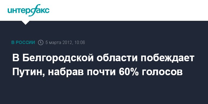 Белгород. 5 марта. INTERFAX.RU - В Белгородской области по результатам обработки 100% протоколов Владимир Путин получил 59,3% голосов избирателей, сообщили "Интерфаксу" в облизбиркоме в понедельник.